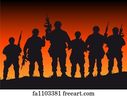 Silhouette of modern troops in Middle East silhouette against be